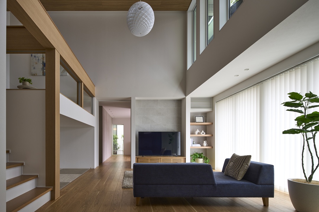 天井まで広がる吹き抜けが、リビングに開放感と心地よい光を運びます。