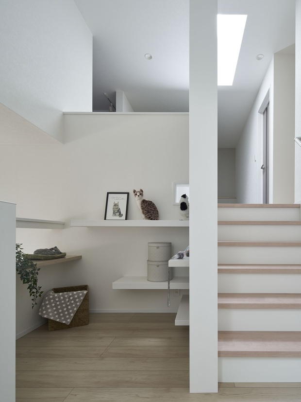 階層をずらすことで生まれた多層空間は、家族の気配を感じながらも、それぞれが自由に過ごせる場所。