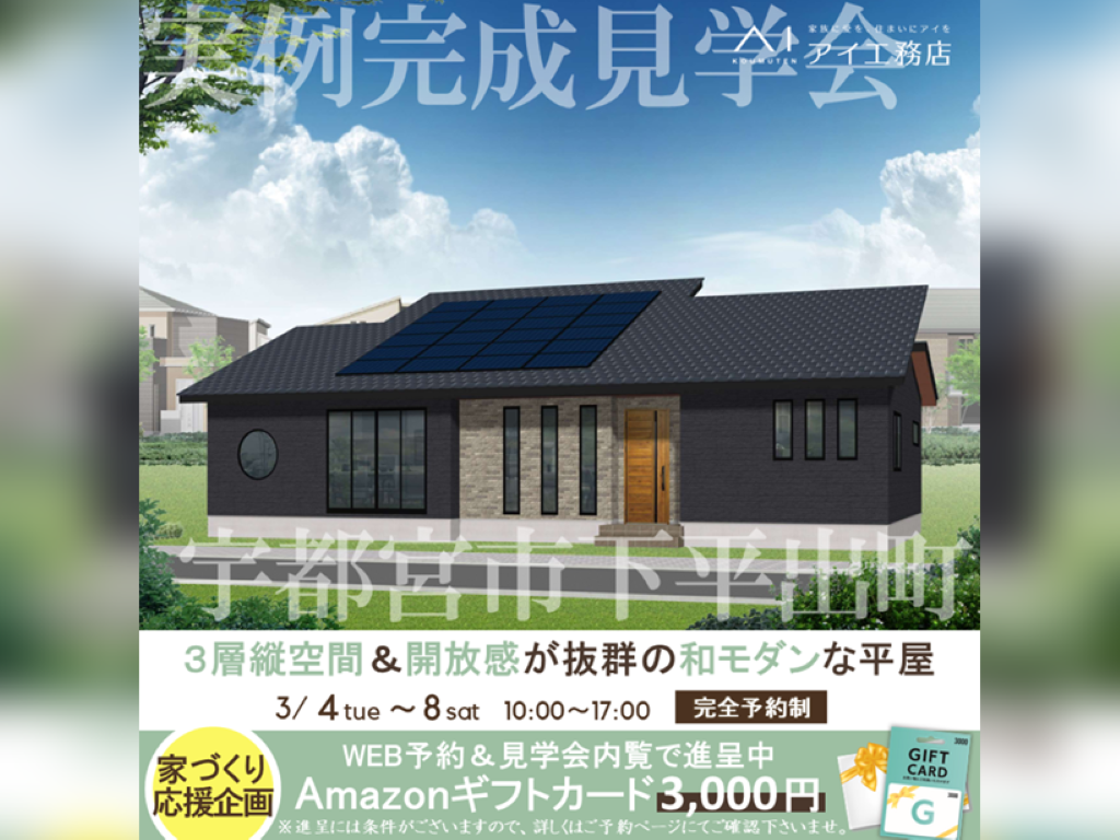 栃木県宇都宮市下平出町にアイ工務店の新築注文住宅【3層縦空間&開放感が抜群の和モダンな平屋】が完成しました。
