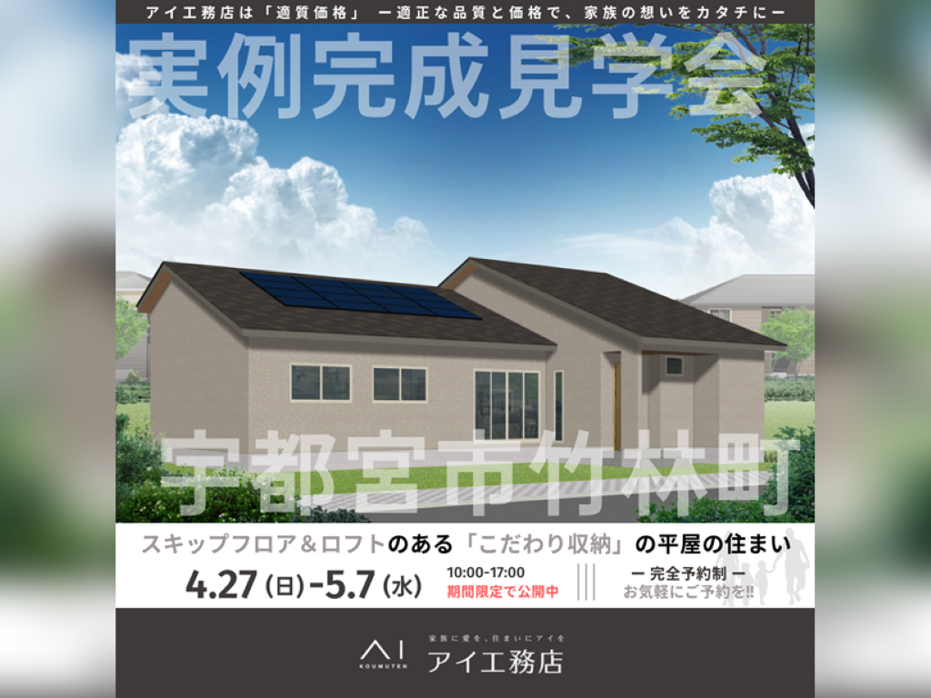 栃木県宇都宮市竹林町にアイ工務店の新築注文住宅【スキップフロア&ロフトのある「こだわり収納」の平屋の住まい】が完成しました。