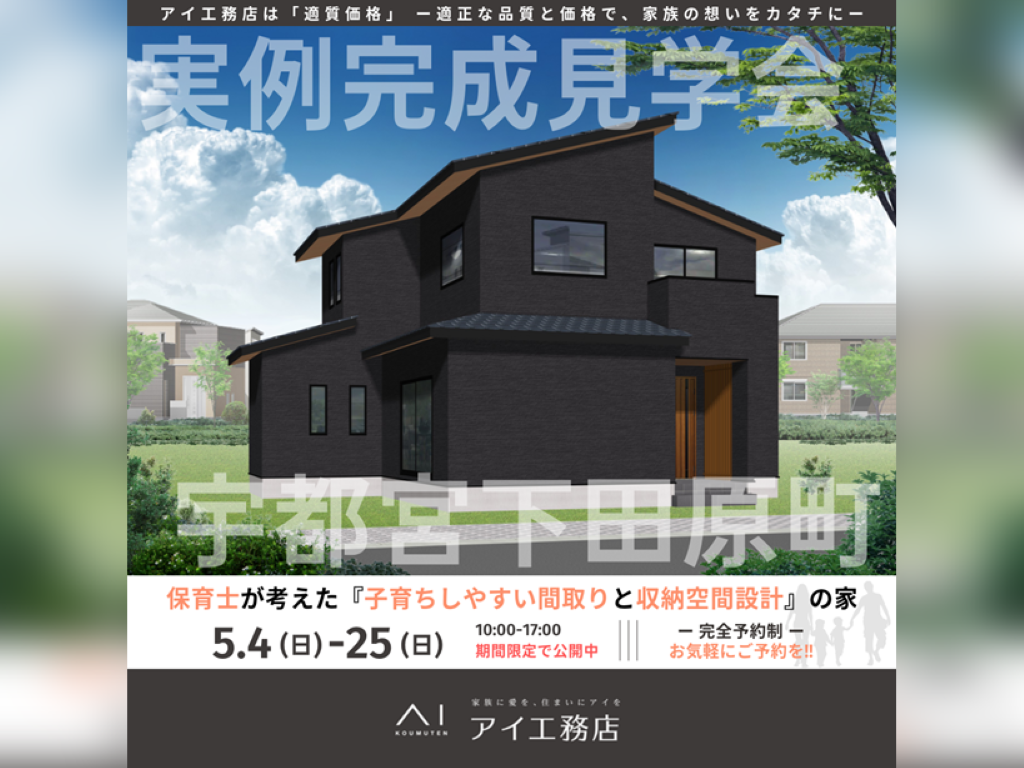 栃木県宇都宮市下田原町にアイ工務店の新築注文住宅【保育士が考えた『子育ちしやすい間取りと収納空間設計』の家】が完成しました。