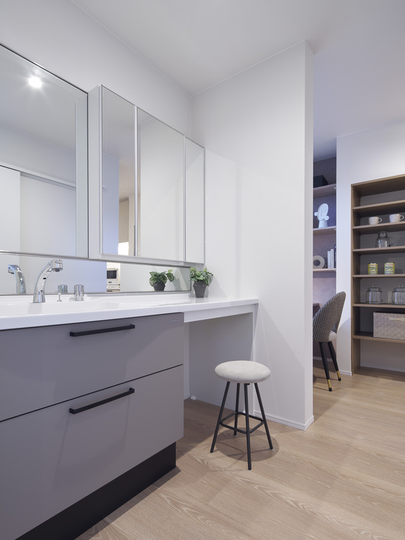 玄関からキッチンに繋がる動線には、洗面スペースやパントリー、ランドリールームを配置。帰宅して手を洗ったり着替えたり、買い物帰りに様々なストック類も収納しやすい、家族みんなが使いやすい間取りです。