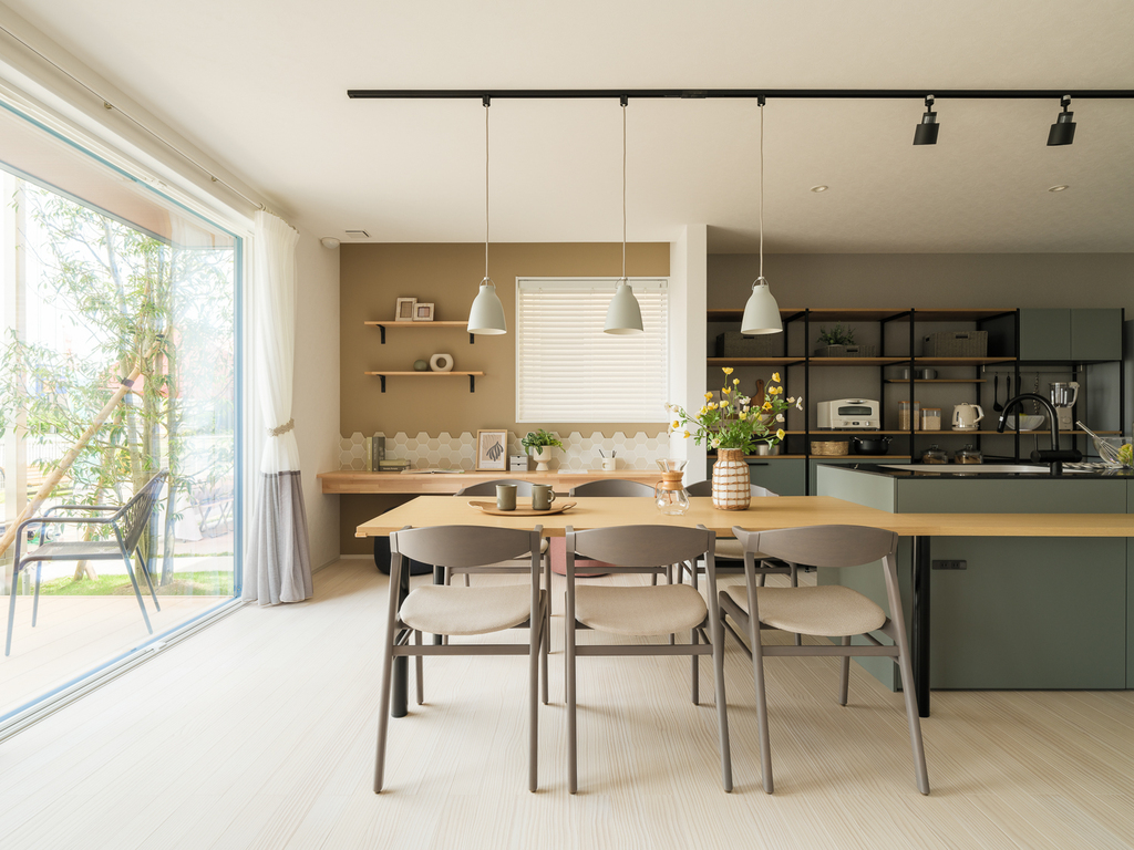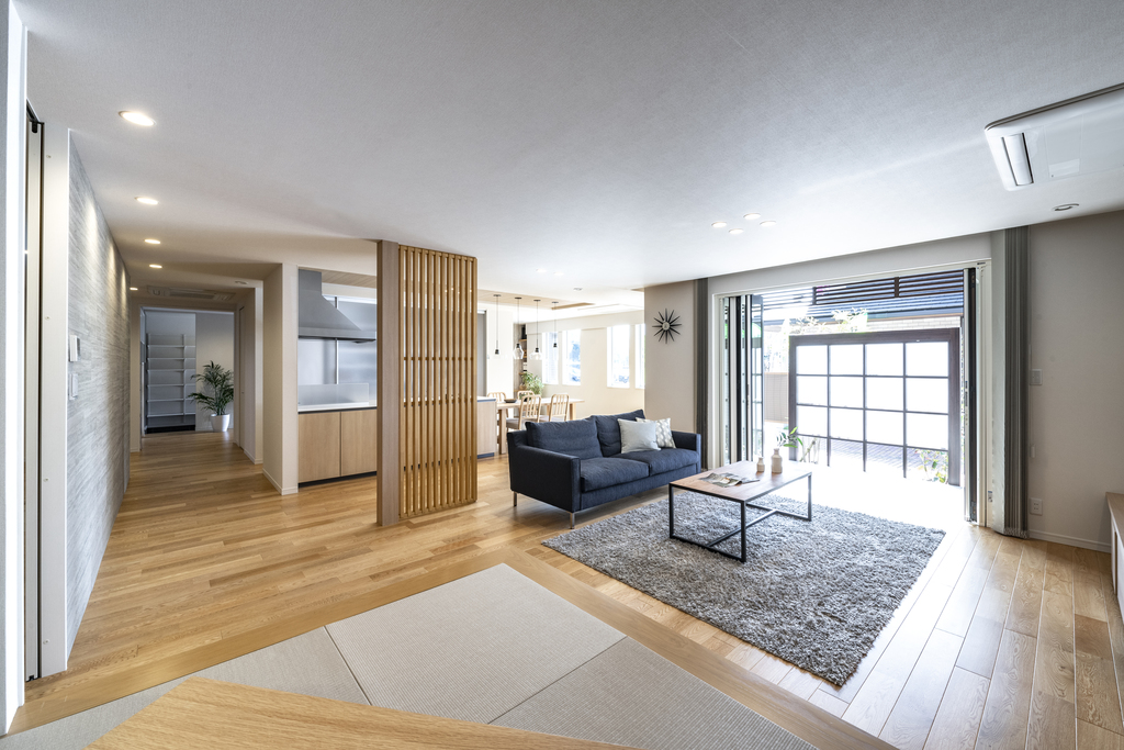 約21帖のLDKには大開口な引違いの窓と、大きな正方形の窓を採用。カーテンボックスも採用しノイズレスで、開放的なくつろぎの空間ができました。間続きのタタミコーナーもあり、ご家族が思い思いにすごせる間取りです。