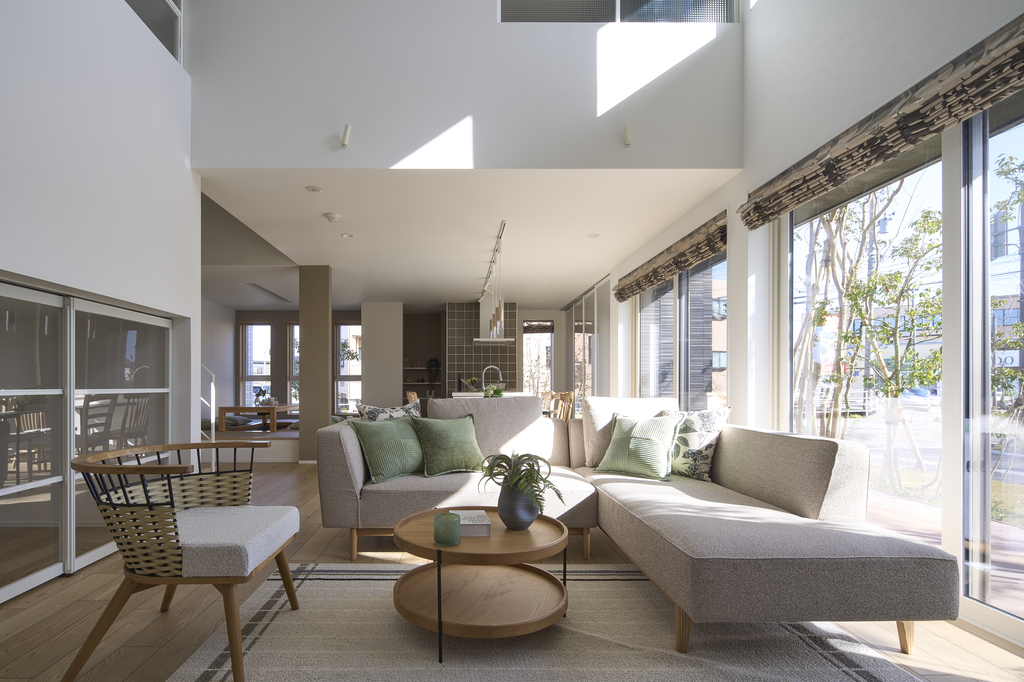 タイルテラスとつながるLDK。空間をより広く見えるように工夫しております。高天井も取り入れ、同じ帖数でも広く感じる工夫を取り入れております。