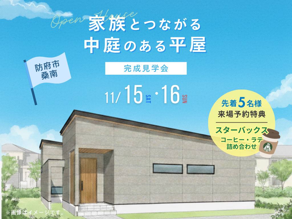 | タイトル | 【完成見学会】家族とつながる中庭のある平屋 |
