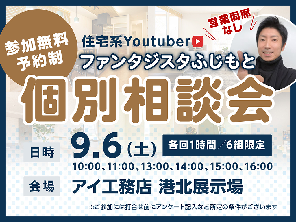 | タイトル | 港北インター展示場 ファンタジスタふじもと 個別相談会【9/6開催】 |