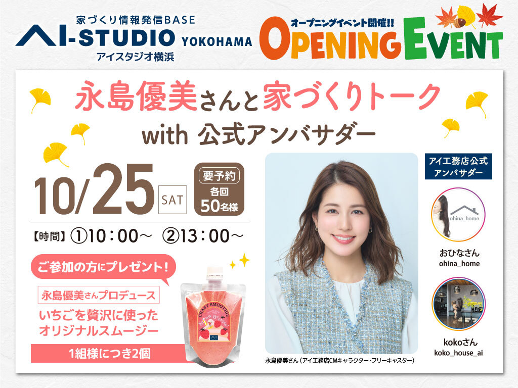 | タイトル | AI-STUDIO-YOKOHAMA オープンイベント【永島優美さんと家づくりトーク】 |