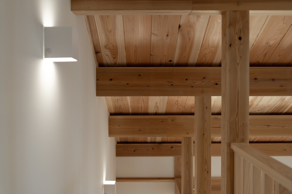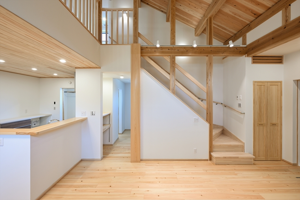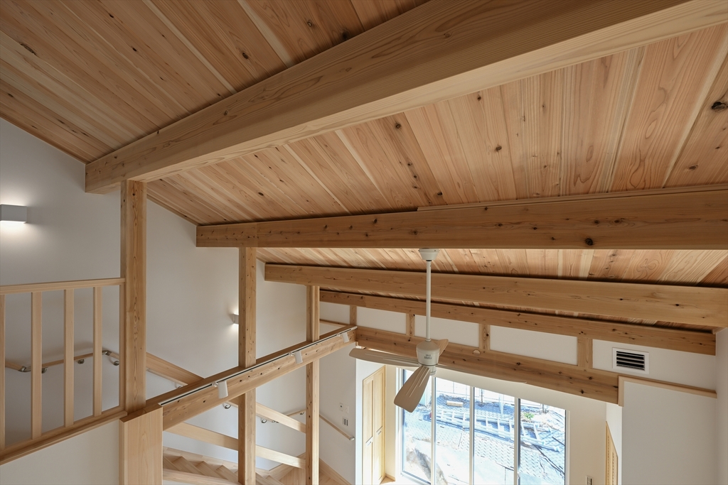 リビング上部の勾配天井は、自然素材の木の質感が際立つデザイン。心地よい広がりとともに、木の香りが住む人を包み込みます。