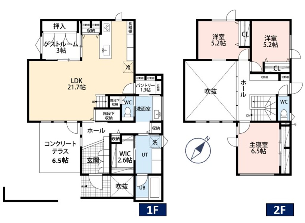 LDKは21.76帖のゆとりある広さに、上部吹抜けの開放的なリビングをプラス。天井埋込照明を採用したダイニングキッチンは、すっきりと洗練された印象に仕上がっています。パントリーをはじめ収納も豊富で、日々の片付けもスムーズ。さらに1階にファミリークローゼットを設け、家事・生活動線の効率化を実現しました。