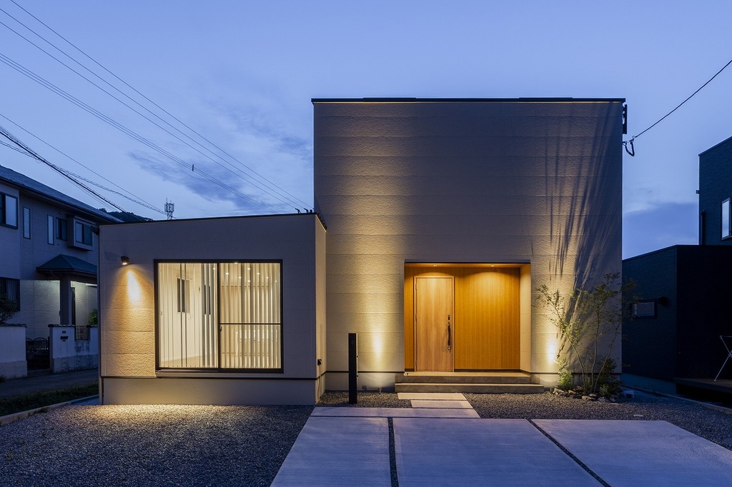 白と木目のコントラストが美しい外観。直線的なフォルムとさりげない植栽が調和し、洗練された印象を与えます。夜には美しいライティングで、表情豊かな外観を楽しめます。