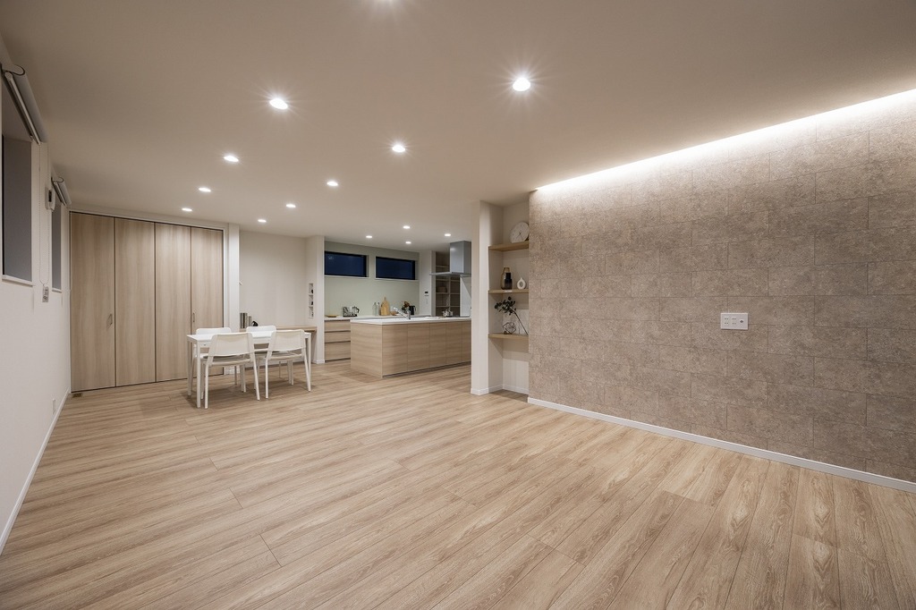 南向きの大きな掃き出し窓と天井照明で、昼夜問わず明るい空間。木目の美しさが際立つ床材と、グレージュのアクセント壁が落ち着きと洗練を演出します。23帖とゆったりとした広さも魅力です。