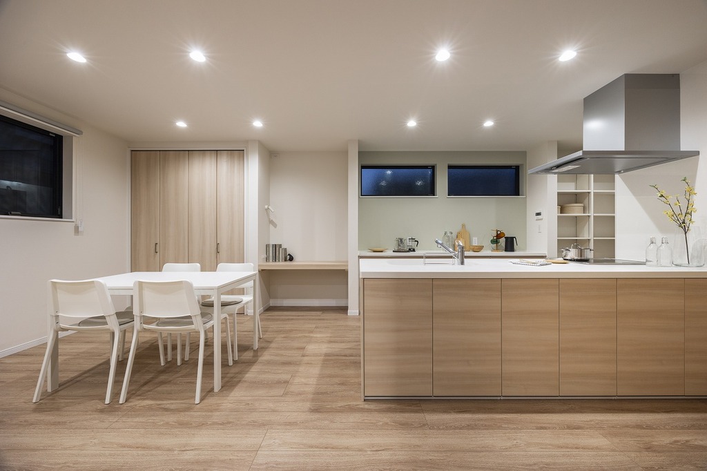家事動線に優れた対面キッチンは、広いワークスペースと豊富な収納が魅力。隣にはダイニングテーブルが設けられ、家族の会話が弾む設計です。