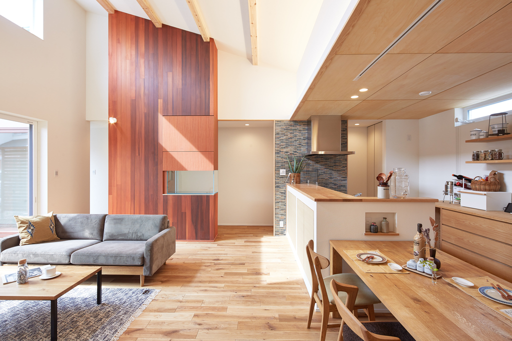 高天井で開放感があり、のびのびとできるリビングダイニング。