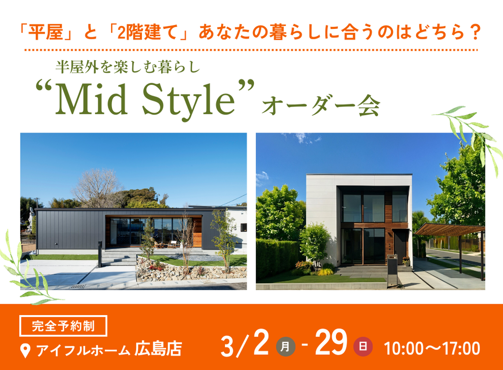 | タイトル | 【広島店】平屋と2階建てあなたの暮らしに合うのはどちら?Mid Styleオーダー会 |