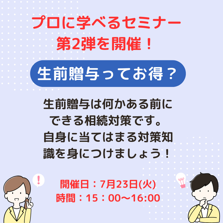 | タイトル | 生前贈与ってお得なの?相続対策について学べるセミナー第2弾! |
