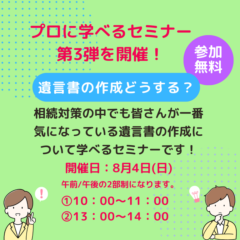 | タイトル | 遺言書の作成ってどうすればいい?相続対策について学べるセミナー第3弾! |
