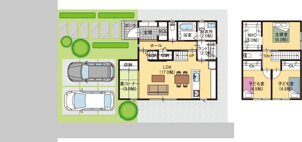 およそ50坪の敷地に延床面積30坪の建物(3LDK+畳コーナー)。駐車場2台可。