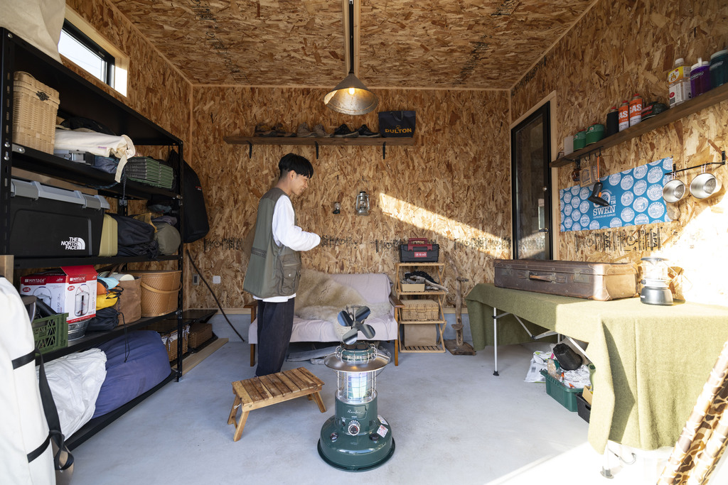 キャンプ用品をスッキリ収納できる専用スペースを確保。
