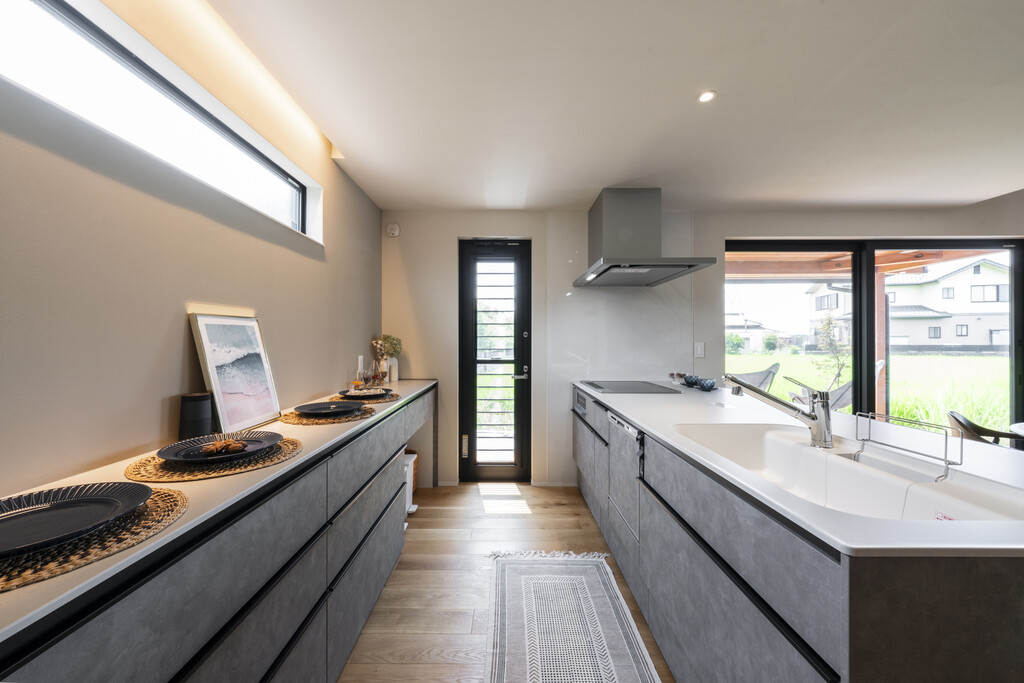 キッチンからはリビングや1つ上のフロアのフリースペースを見渡すことができるので、小さいお子さんがいても安心して家事をこなすことができます。