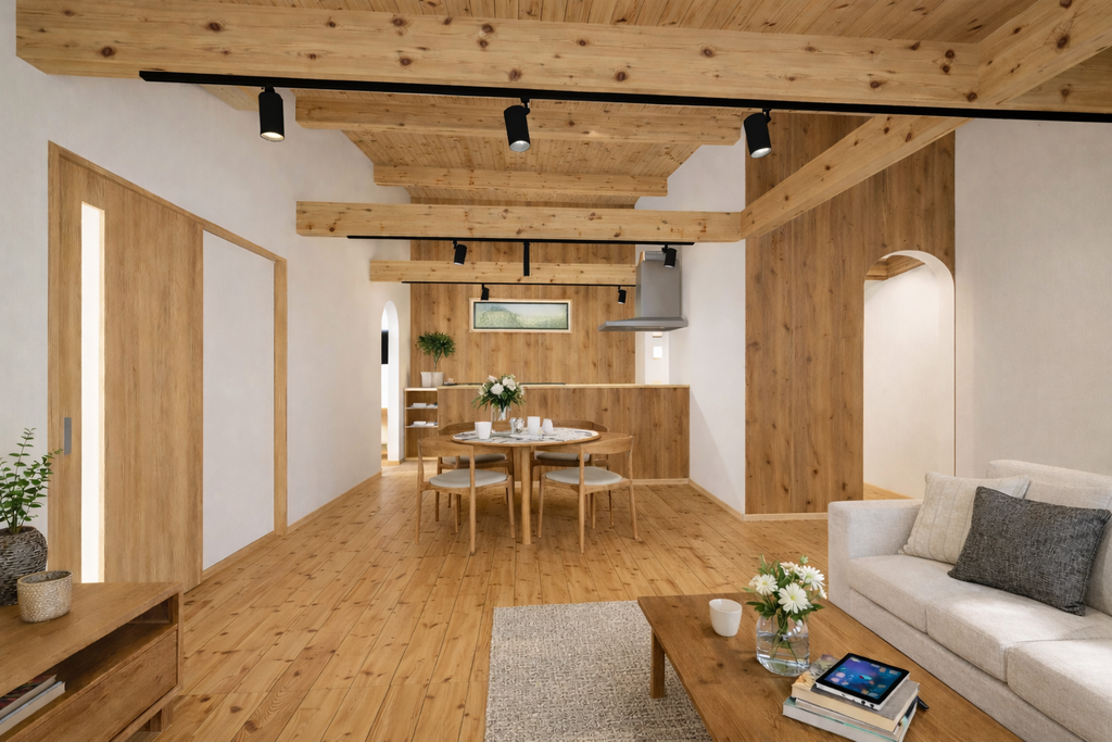 無垢材の床、勾配天井の開放感、