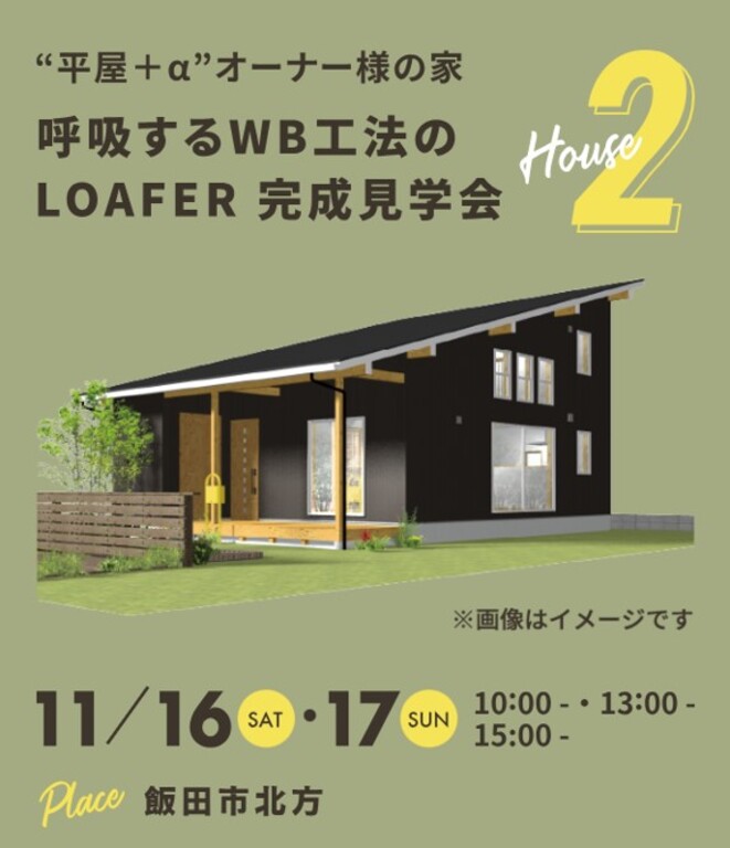 | タイトル | 【完全予約制】“平屋+αの家” 呼吸するWB工法のLOAFER 完成見学会 in飯田市北方 |