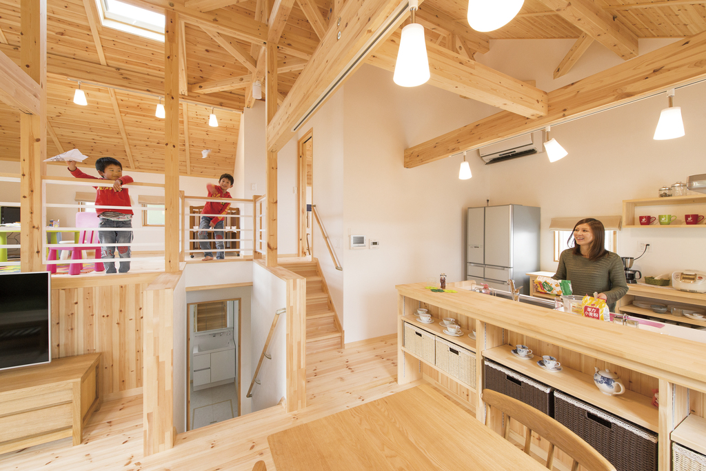 LDKが開放的で天井全面板張り。どこにいても家族が一緒の空間。