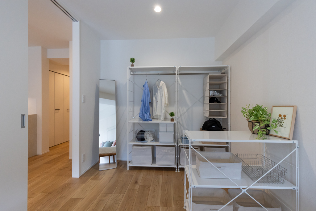 LDKは家族や友人とゆったり過ごせる広さ。キッチンとダイニングが直線でつながり、毎日の家事がスムーズです。寝室とリビングは引き戸で緩やかに区切られ、オン・オフの切り替えも自由自在。大きなウォークインクローゼットで、衣類や生活用品もきれいに収納。シンプルな暮らしを叶えます。