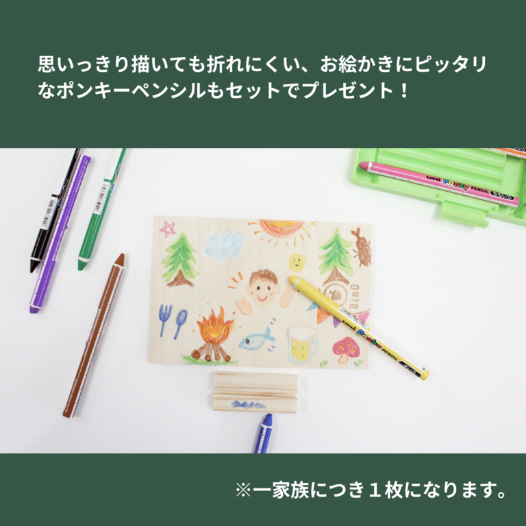 木製のハガキをキャンバスに、色鮮やかなポンキーペンシルを使って、自由にお絵描きしていただけます。