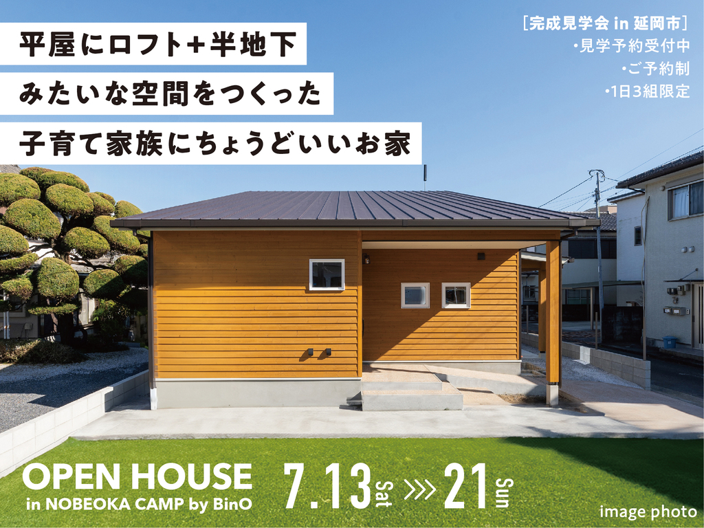 7/13(土)〜21(日) の期間中、BinOシリーズのCAMP「平屋にロフト+半地下みたいな空間をつくった、子育て家族にちょうどいいお家」完成見学会 in 延岡を開催します!!