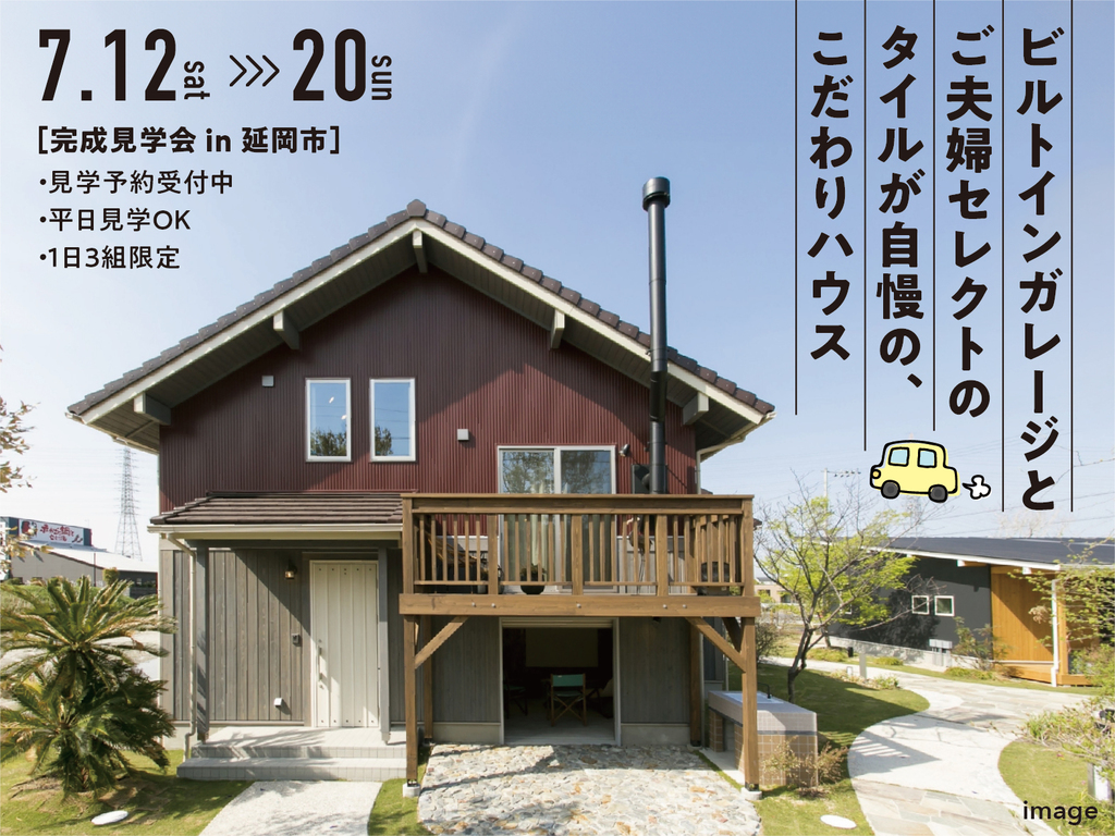 7/12〜20の期間中「ビルトインガレージとご夫婦セレクトのタイルが自慢のこだわりハウス」完成見学会を延岡市で開催!晴レル住建こだわりの新築住宅の実物を見てみませんか?