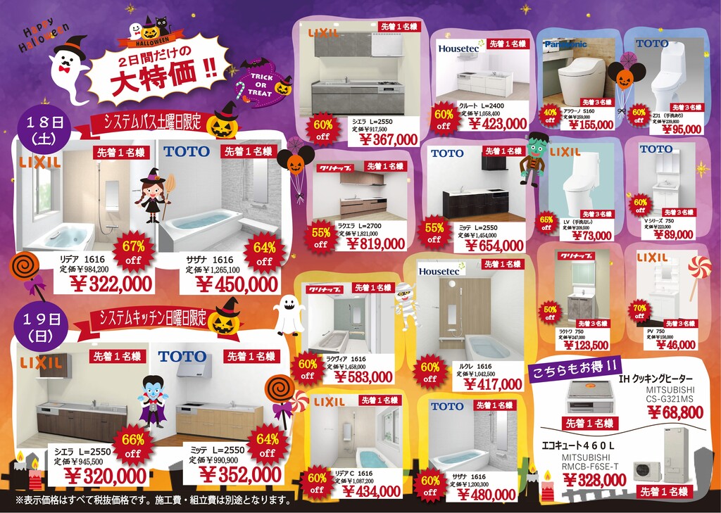 10月18日19日の2日間、㈱福栄様ショールームにて『第7回リフォームフェア~蘇える我が家~*HAPPY HALLOWEEN*』を開催致します。水廻りのお得な商品を実際にみてふれて体感してみて下さい。そして、今回は10月開催とゆうことで皆様に楽しんで頂けるようハロウィンにちなんだ催し物もご用意しております。ちょこっと仮装をして是非ご来場下さい。♡Trick or Treat♡