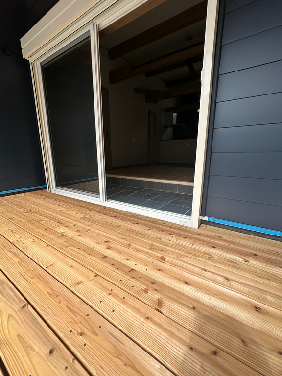 掃き出し窓の内側に土間を設け、出入りもスムーズに。今後、オーナー様のご家族やご夫婦ご自身が年を重ねても、安心して暮らせるように、ライフスタイルの変化に柔軟に対応できる設計です。