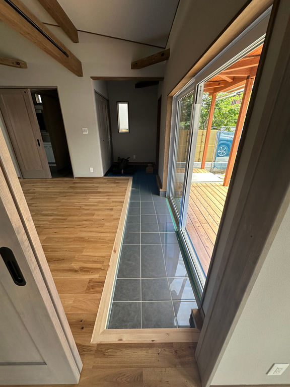 さらに、将来的にライフスタイルが変わっても安心して暮らせる工夫を取り入れています。掃き出し窓の内側には土間スペースを設け、例えば車いすが必要になった場合の出入りもスムーズに。オーナー様のご家族やご夫婦ご自身が年を重ねても、快適に過ごせる設計です。