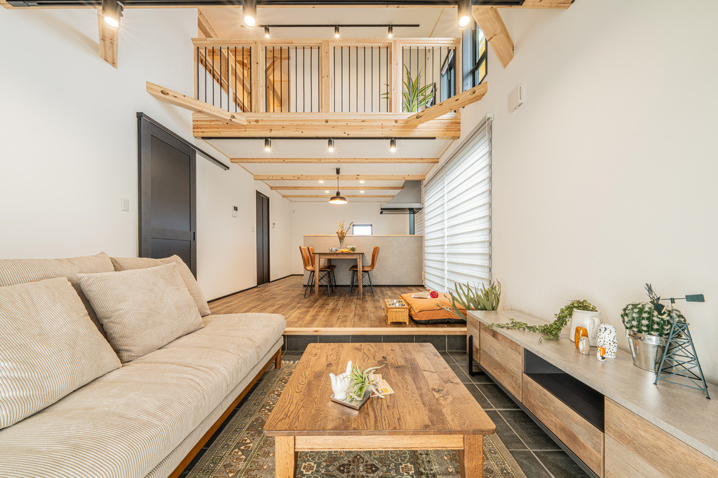1つの空間に床の高さで仕切りを作る事によりできたリビングは少しだけ特別な場所。