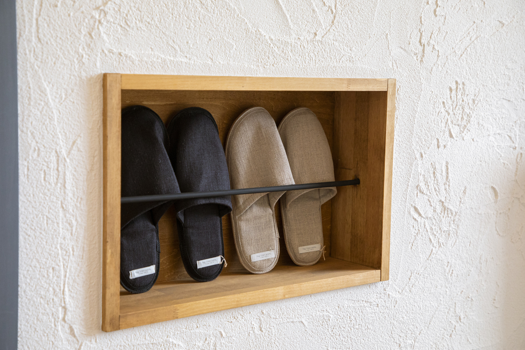 グリーンの外壁に黒を基調とした内装。かっこよさと実用性を兼ね備えた今どきな二階建てのお家です。壁をへこませて、小物を飾ったりスイッチ類をまとめたりできる”ニッチ”がふんだんに作られています。ニッチがあることで壁の中に収納できるため、スペースを有効活用することができます。ぜひ、足を運んでいただき、デザインのこだわりや使いやすさを体感してみませんか。