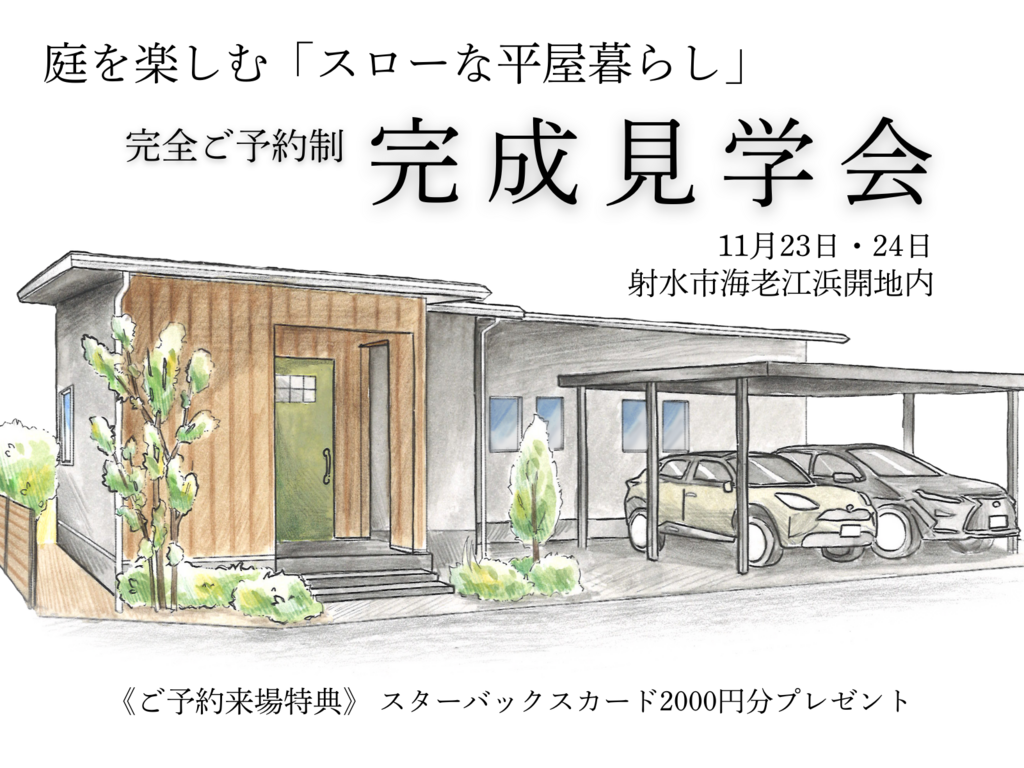 | タイトル | 11月23日・24日 射水市海老江浜開 予約制見学会 「庭を楽しむスローな暮らし」 |