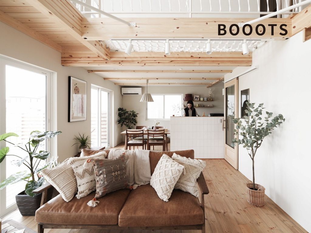 2階建てでも平屋のようにくらしたい。 そんな声から生まれた、大きな開口と吹き抜け、土間リビングのある住まい。四連窓の大パノラマが光と風、季節の風景を取り込んで自然に寄り添うくらしを実現。内と外、オンとオフなど、さまざまなくらしのシーンをボーダーレスにつなぎます。