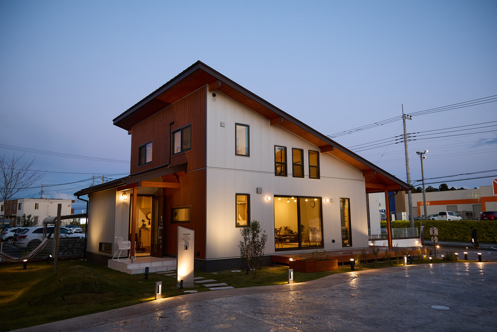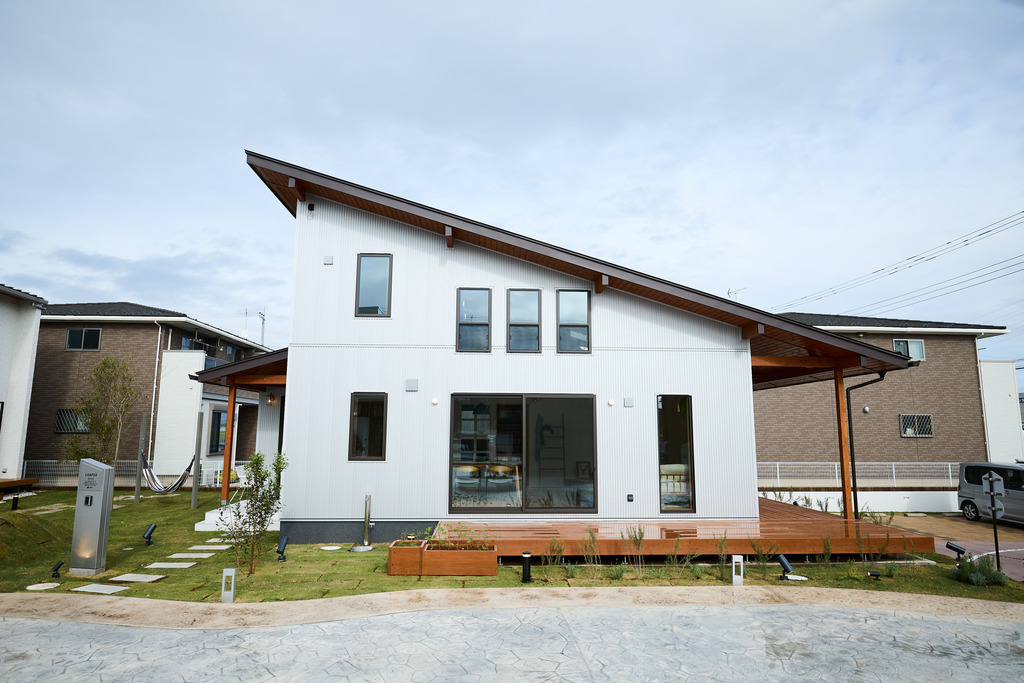 安定感あるシンプルなフォルムの中にも個性が光る2階建て。屋根形状は、夏の直射日光を遮り、冬の日差しを取り込めるパッシブデザイン。ソーラーパネルを搭載した時、最も効率よく発電できる角度に設計されています。