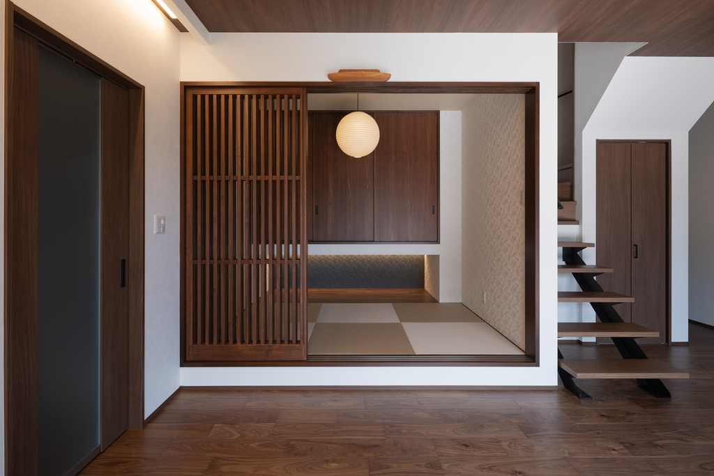 小上りの和室、和モダンな照明器具、格子の戸、オープン階段など家族が楽しく集まれるリビング