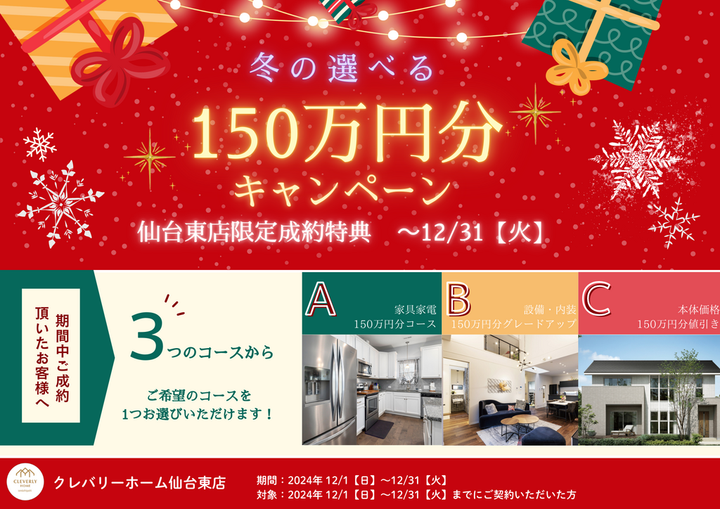 クレバリーホーム仙台東店限定でご成約頂いたお客様に、3つのコースからお選び頂ける✨ご成約特典✨をご用意しました!