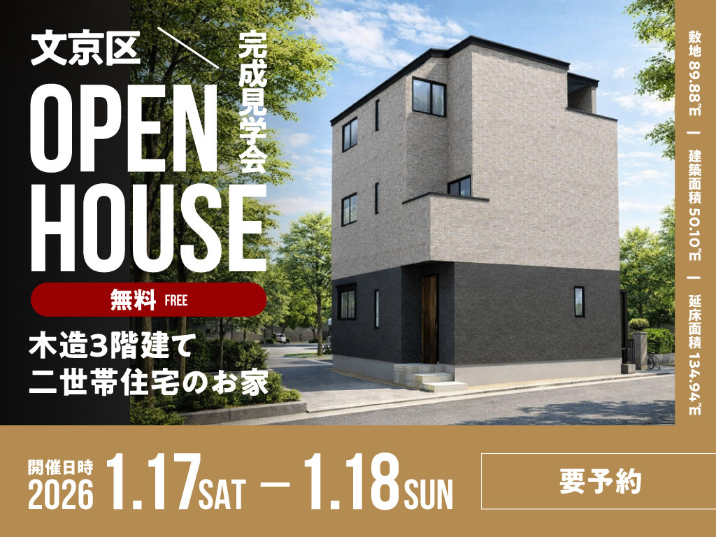 | タイトル | 【文京区】敷地約27坪 木造3階建て二世帯住宅のお家 完成見学会 |