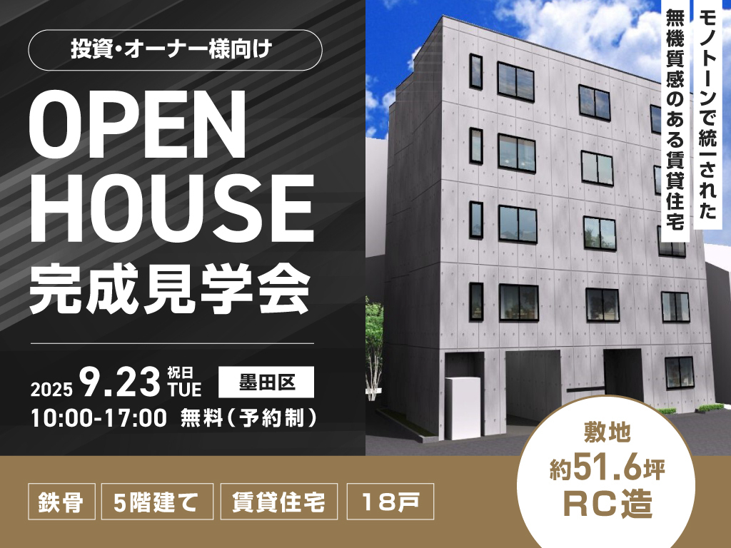 タイトル | 【墨田区】投資用に最適!敷地約51.6坪/RC造5階建て オーナー様向け賃貸住宅完成見学会 |