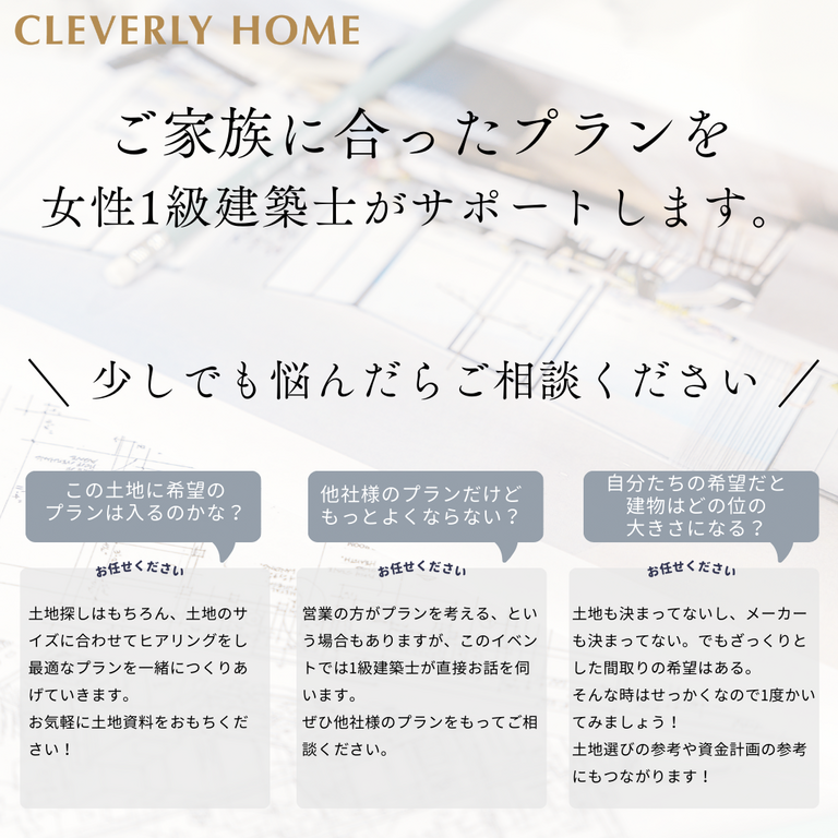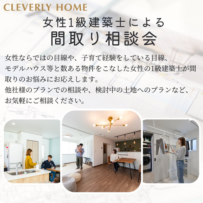 女性1級建築士による間取り相談会を開催します。家族のライフスタイルや子育ての視点を大切にした間取りの提案を、女性ならではの細やかな目線でお届けします。
