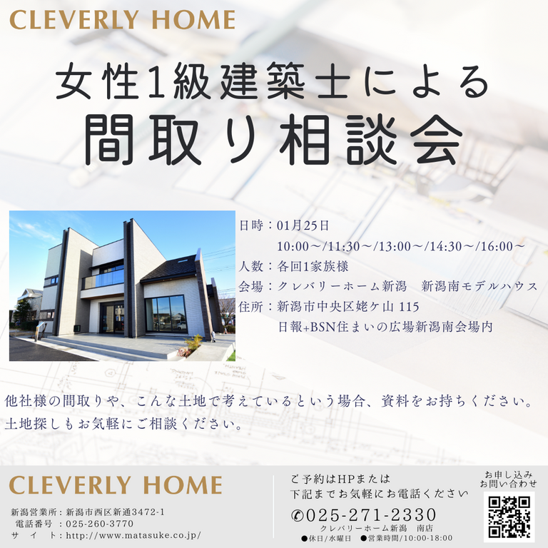 | 開催場所 | 新潟県新潟市中央区姥ケ山115 日報+BSN住まいの広場新潟南会場 クレバリーホーム新潟南店 |