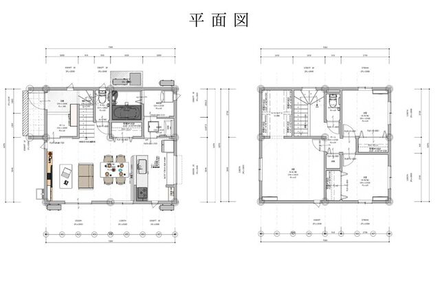 リビングとダイニングを一体化した間取り。リビングには掃き出し窓があり、お庭と一緒にリビングの暮らしを楽しむことができます。キッチンからは水回りにすぐにアクセスできるように設計しており、洗面室と脱衣室が別々のため、入浴中の人と洗面台を使いたい人が同時にいても、お互いに邪魔することなくスムーズに行動できます。