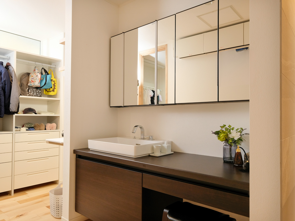 洗面やランドリールームなどの水まわりから収納までがスムーズにつながる設計。