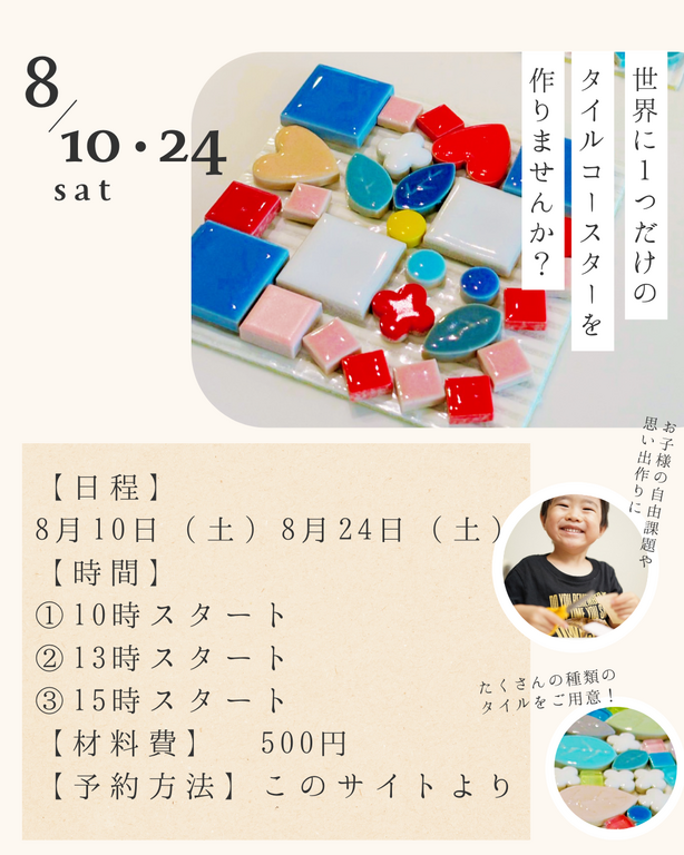 8月にタイルコースター作りイベントを開催します!