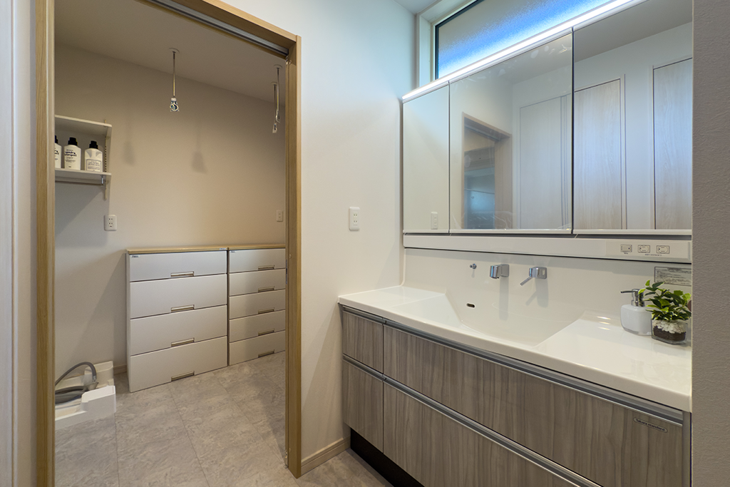 ランドリールームを兼ねた脱衣室で物干しをしたら、リビングを通らずウォークインクローゼットへ。