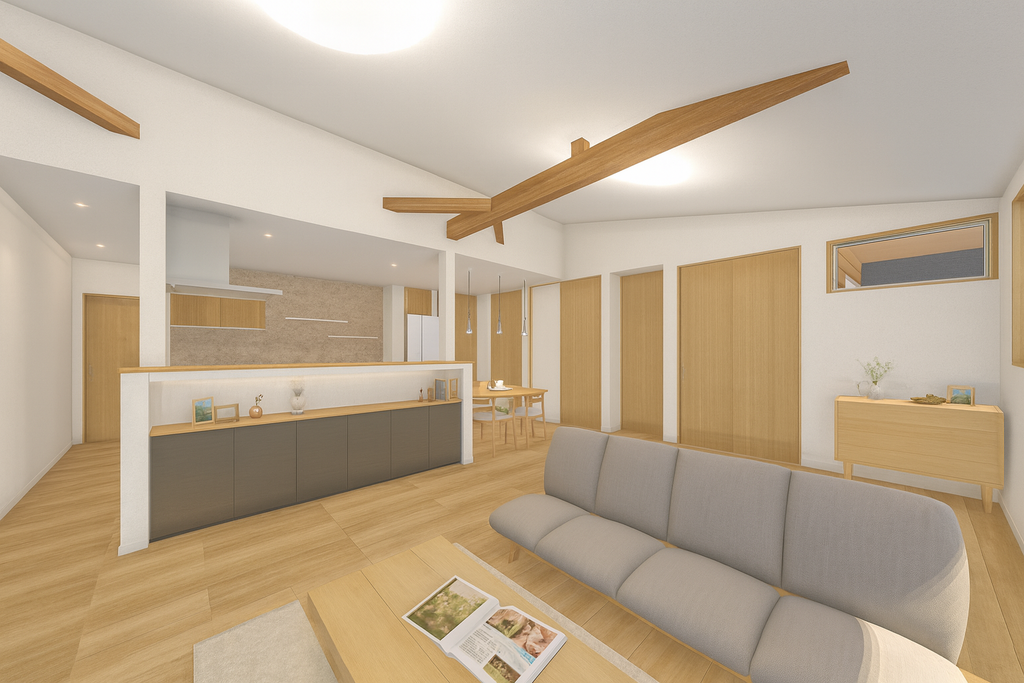 勾配天井を大きくとったリビングは、ソファの後ろ側にゆとりをもたせました。