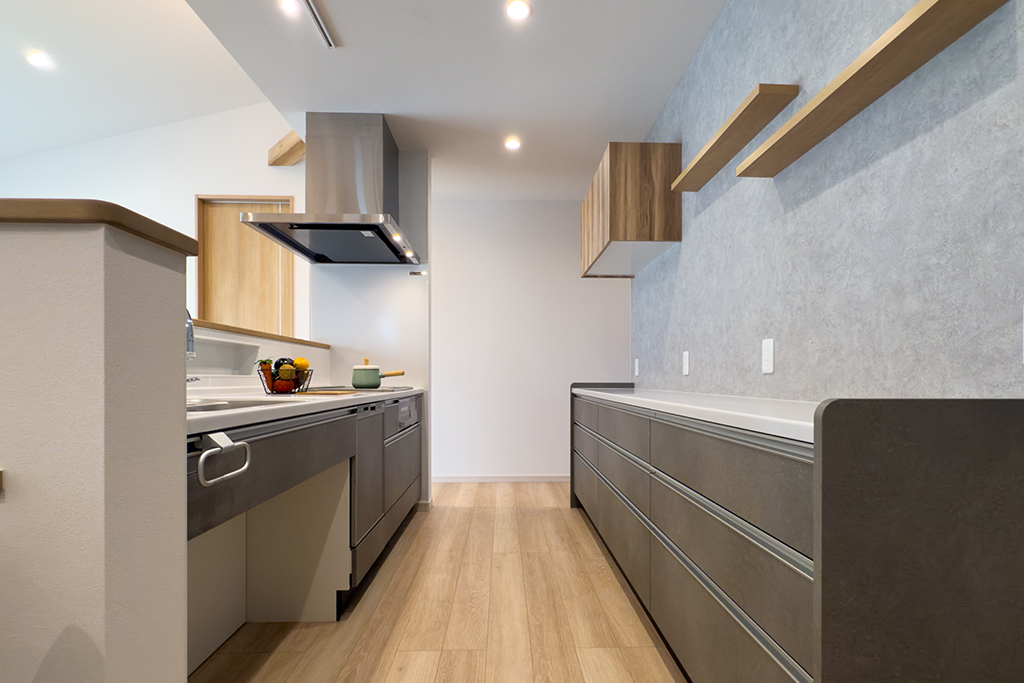 横付けレイアウトのダイニングキッチンは配膳の効率がよく、キッチンを対面で使うことで大人数で集まったときも皆で食卓を囲むことができます。